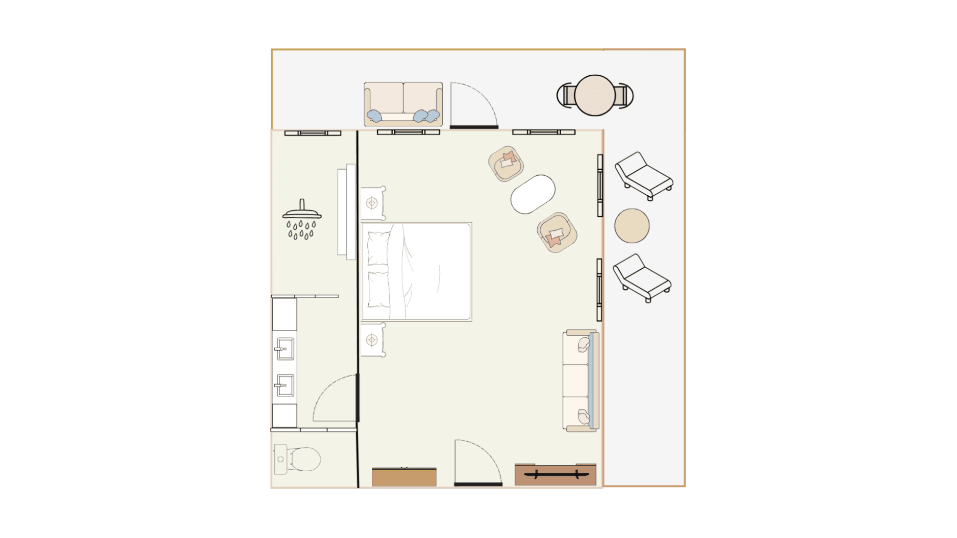 Even the grand shower room (complete with privacy screen) looks out to the Caribbean. With customisable lights, rainforest shower and six horizontal massage jets, you can deeply refresh and revive after salty sea days.